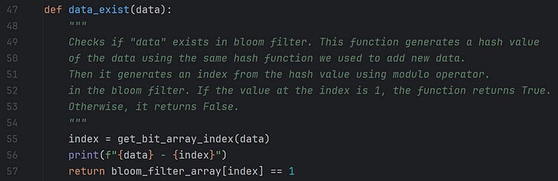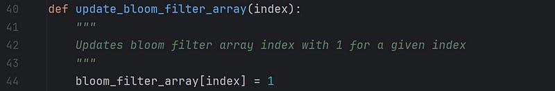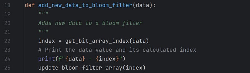 The above function first generates an index of the data passed by calling the function get_bit_array_index(data), prints the same, and finally updates the index of the bloom filter bit array with the value 1 by calling the function update_bloom_filter_array(index).