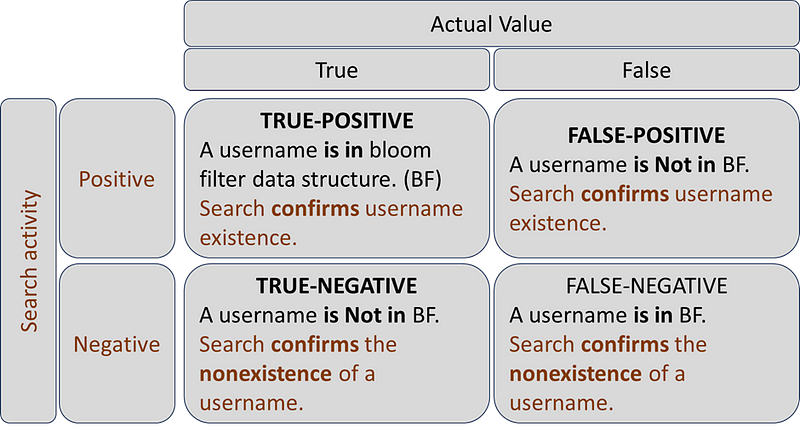 3. True — Negative. When a username is Not in the BFDS. Checking for a username in the BFDS confirms its non-existence.
