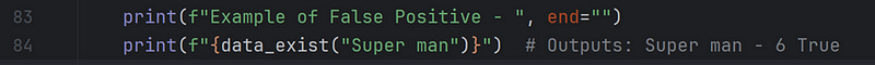Finally, in the code segment below, I demonstrate an example of a False Positive. The BFDS says “True” when we try to find “Super man” in our bloom filter. It matches the index of “Loki” and “Spider man.”