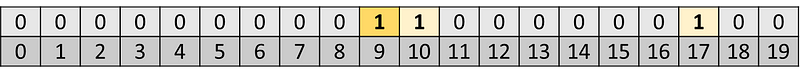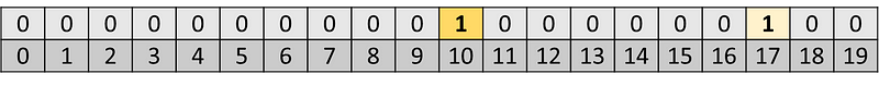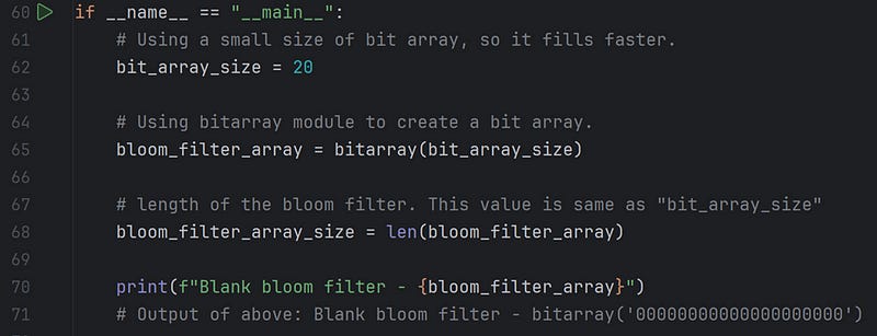I added twelve entries to the bloom filter in the above code segment. For each entry, an index is mapped in the bloom filter and is set to 1. We’ll see the details in a while.