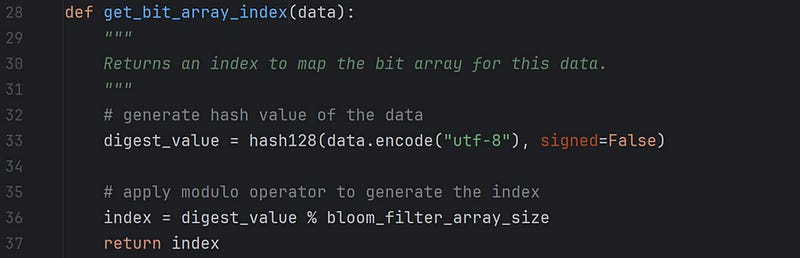 The above function uses the hash function hash128 to generate a hash value for the data. The function accepts the data input as a string, bytes, or array. I have used UTF-8 encoded bytes as input, and the function returns a 128-bit unsigned integer as a hash value. Finally, I use the modulo operator to generate the index of the bit-array for the given input and return this to the calling function.