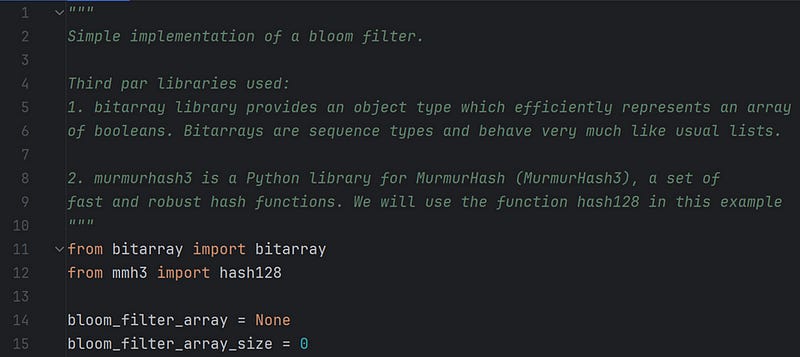 In the above code, we start with using two libraries. First is bitarry, which we use to create a bit-array for our bloom filter. The second is mmh3, and we use the function hash128 to generate a hash value of the data we will add to the bloom filter.