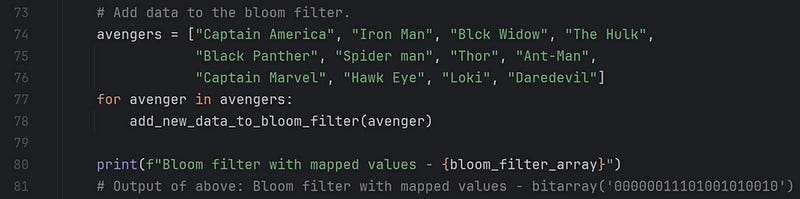 Now, the implementation starts with a call to the function add_new_data_to_bloom_filter(avenger) at #78