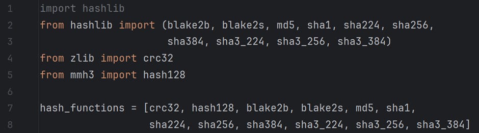 Since we will need many hash functions, I have enlisted various hash functions that the Python library hashlib provides. I have also used zlib for crc32 and mmh3 for the hash128 function. These are mentioned in the file /For Articles/Bloom Filter — Part 2/hashes.py on GitHub. Refer to the code snippet below.