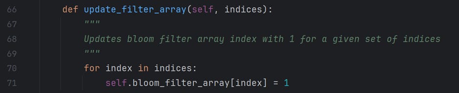 In this section of the code, I execute a for loop to execute the hash functions and calculate the index values for the data element. In this example, the max_hashes value is set to 7. So, the first 7 functions enlisted in the array “hash_functions” will be used to calculate indices.