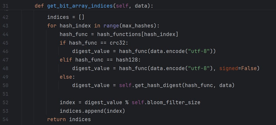 All of these hash functions return an integer value, the hash_digest. The hash_digest is then “modulo-ed” by the bit-array size to calculate the index of an array. The indices are returned to the calling method “add_new_data.”
