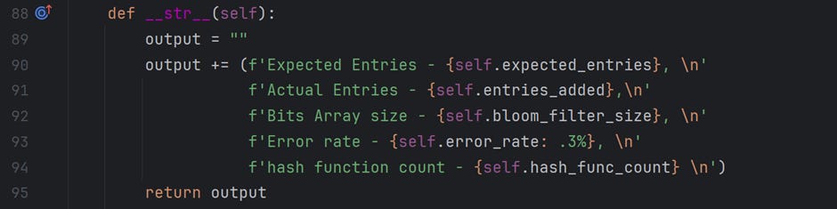 The last method is __str__(). This prints the details of a Bloom Filter object, which is useful while playing around with and debugging the code.