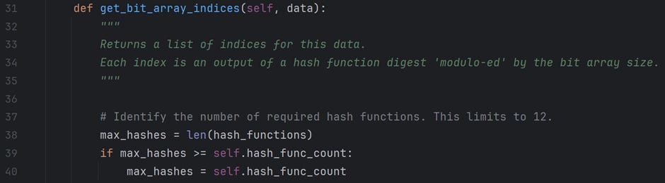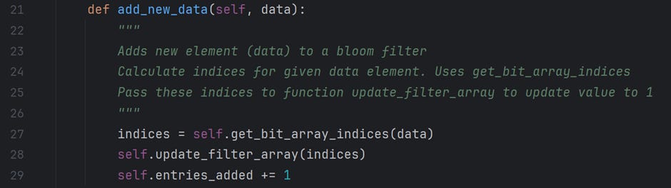 This method is responsible for adding new data elements to the bloom filter. To do this, it calls the function “get_bit_array_indices” to map the indices against the given data. Then, it updates the bloom filter array indices with the value 1 and increments the entries_added attribute. Now, we will get into the details of the function “get_bit_array_indices.”