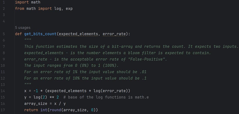 The above calculations are coded in Python and available in the file /For Article/Bloom filter — Part 2/measurements.py on GitHub. Please feel free to play around with the code. The following is a snapshot of the functions; the documentation explains their functionality quite well.