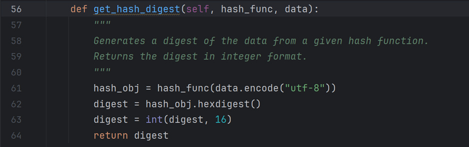 As mentioned, the function get_hash_digest executes the functions imported from the module hashlib. It starts by encoding the data value in “UTF-8” format and passing this string to a hash_func that returns a “hash” object. I gather the digest or hash value in hexadecimal format from this hash object and return it after converting it to an integer value.