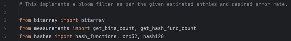 We start by importing bitarray module, which implements a bit-array. From the measurements module, we import two functions: get_bits_count and get_hash_func_count. The functionality of these two functions has already been explained above. Finally, from the hashes module, we import an array of hash_functions. This array has the names of all the hash functions available for use.