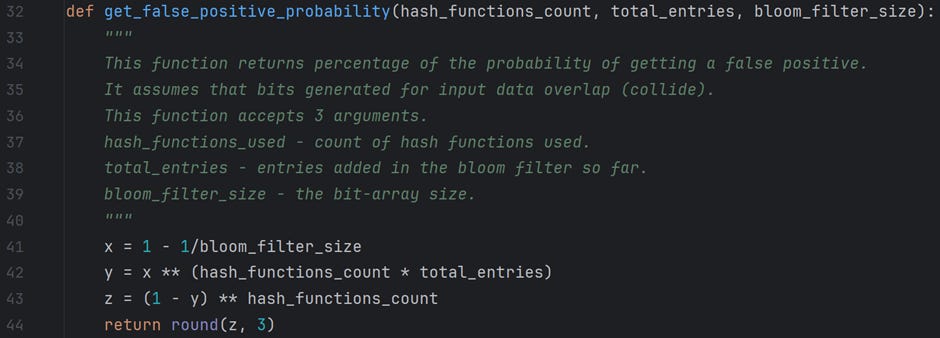 We also learned about a formula to calculate the expected rate of “False-Positive” based on the number of data elements added to a bloom filter.